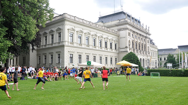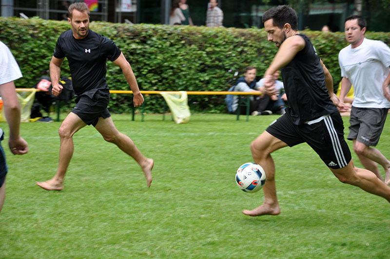 Kurz bevor die Fußball-Europameisterschaft in Frankreich losgeht, jagten 20 Teams an der Uni Graz dem runden Leder hinterher - und das barfuß! Beim mittlerweile schon traditionellen Barefoot World Cup treten (Erasmus-)Studierende sowie die Professoren-Mannschaft der REWI-Fakultät, bestehend aus Michael Friedrich, Klaus Poier, Hannes Schütz, Johannes Zollner und Kapitän Bernd Wieser, gegeneinander an. Aus Freude am Fußball verbringen sie einen sportlichen Nachmittag im Sinne des Fairplay am Campus: Gespielt wird nicht nur ohne Schuhe, sondern auch ohne SchiedsrichterIn und TorhüterIn.