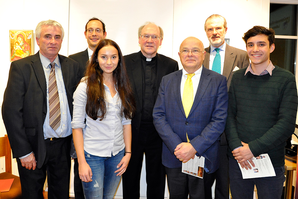 Präsentieren Wege in eine gemeinsame Zukunft: Botschafter Clemens Koja, Projektleiter Jürgen Pirker, Katja Wrolich, Schülerin des BG für Slowenen, Bischof Alois Schwarz, Dekan Joseph Marko, Martin Pandel, Bildungsreferent des zweisprachigen Bildungshauses Sodalitas und Lukas Krassnitzer, Schüler des BG Tanzenberg. Foto: Gotthard