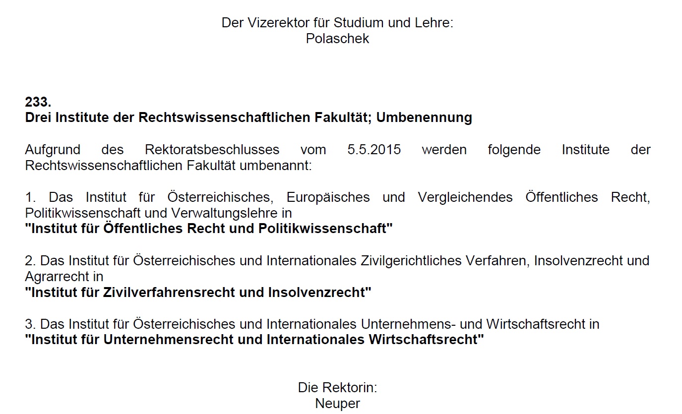 Die Umbenennung des Instituts in "Institut für Öffentliches Recht und Politikwissenschaft" wurde am 05.05.2015 vom Rektorat beschlossen und am 13.05.2015 im Mitteilungsblatt Nummer 32 veröffentlicht.